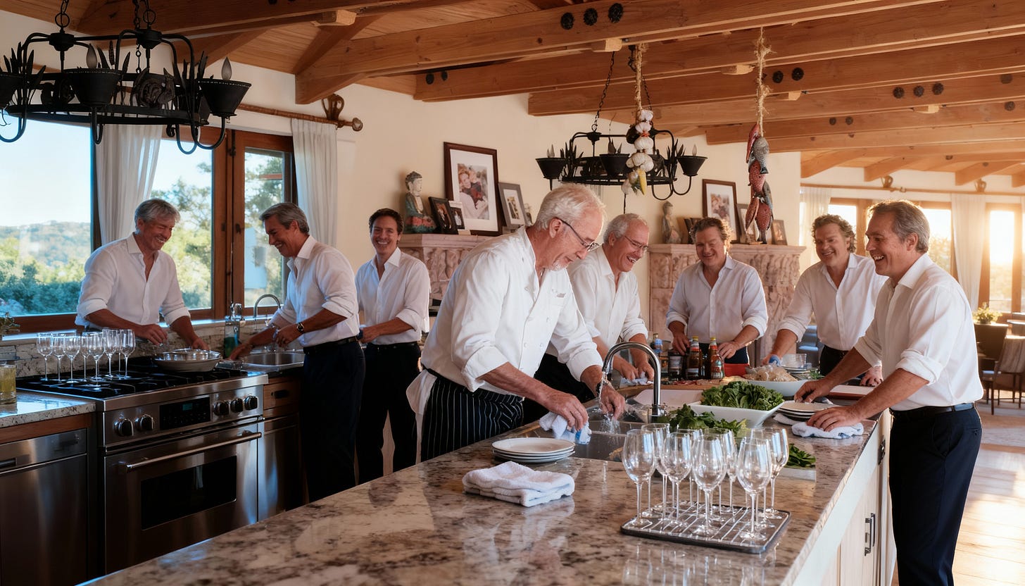 Here’s how it went: We’d hit the farmers’ market in the morning. Shop for everything. Start cooking around 2:00 PM - all the prep, making desserts, everything from scratch. Wives and significant others would arrive at 6:00. I taught the guys how to plate and serve. And when dinner was done? We cleaned up. All of us. CEOs washing dishes. Mopping floors. I didn’t bring in help for cleanup.